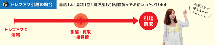 お引越し前は水道・ガス・電気などの手続きや、引越会社選びなどもあり、不用品のリサイクルや処分の手配までなかなか手が回らないもの。トレファク引越では「引越」と「買取」両方をまとめてお見積できるため、お引越し前の忙しい時間を有効にお使いいただけます。